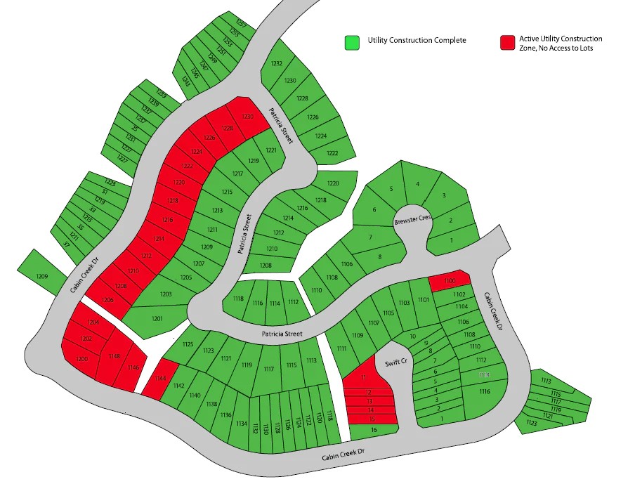 ATCO has published an updated map showing which lots in Cabin Creek West have been 'released' following completion of utility re-installation work. Builders working on active construction zone properties should contact ATCO directly about starting work on those lots.