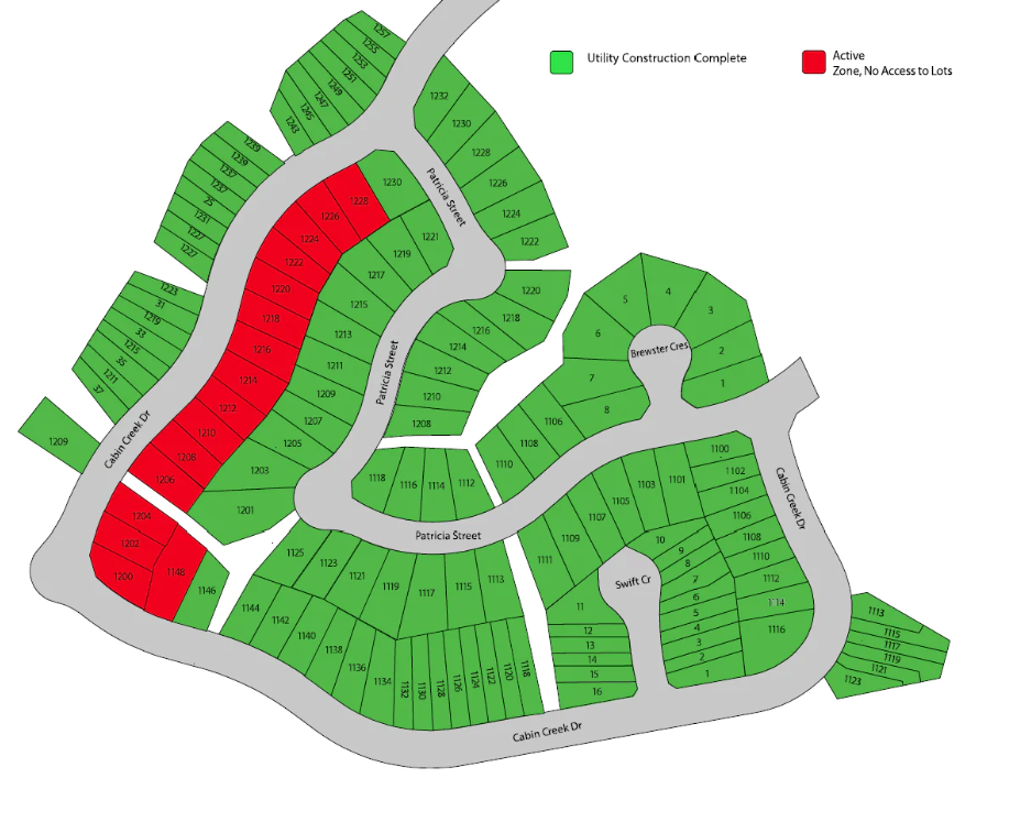 ATCO has published an updated map showing which lots in Cabin Creek West have been 'released' following completion of utility re-installation work. Builders working on active construction zone properties should contact ATCO directly about starting work on those lots.